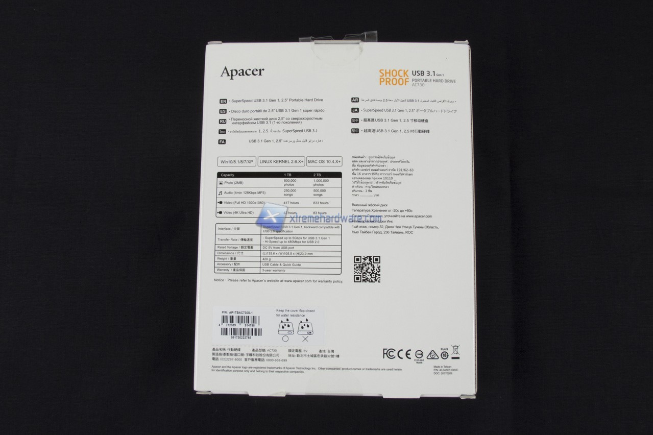 L’Hard Disk esterno Apacer AC730 ci giungerà in una confezione di cartone esterna e blister in plastica trasparente interno. Ciò ci permetterà di prendere immediatamente visione del prodotto. Non mancano le ulteriori e classiche informazioni circa modello, brand, specifiche e caratteristiche del prodotto stesso.